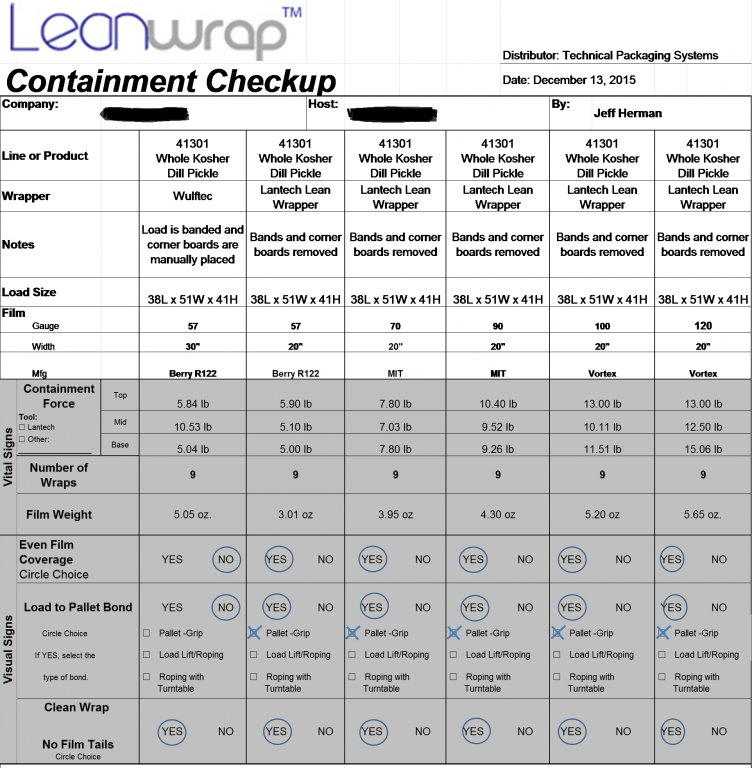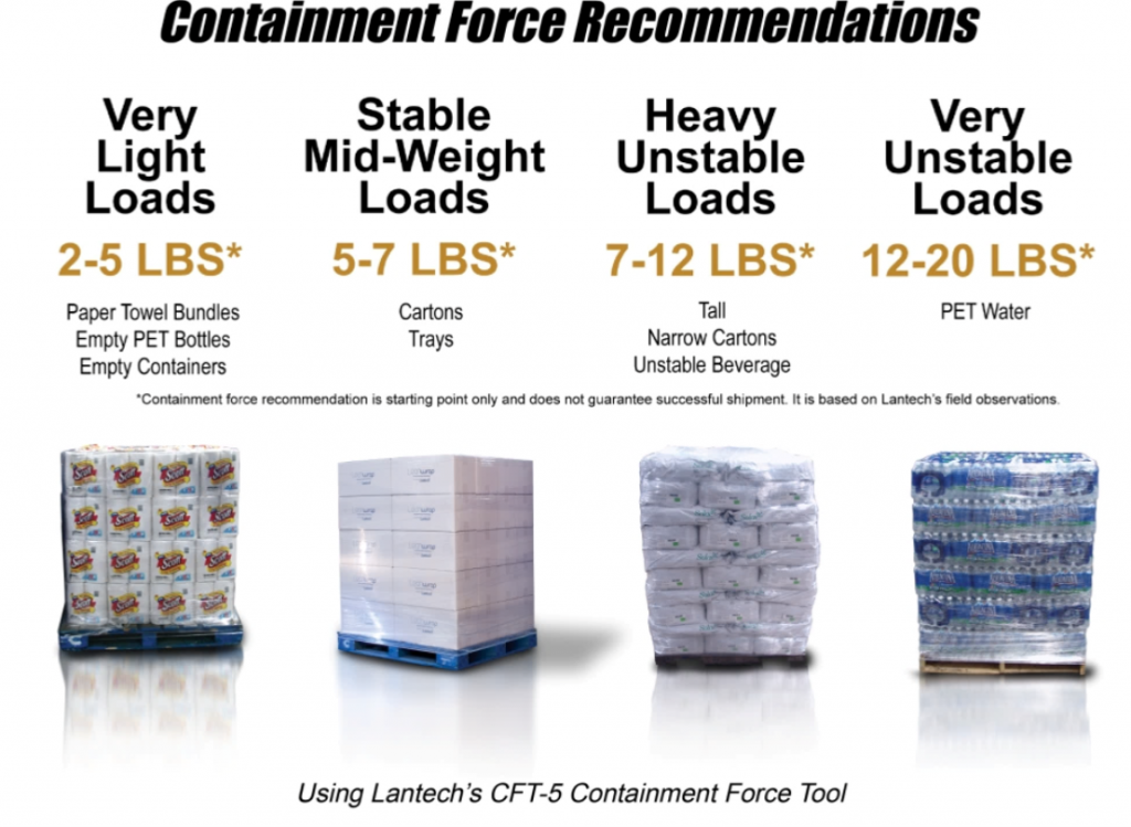 The pictures below show the original wrap pattern the customer was using to secure the load as well as the load after Technical Packaging Systems conducted its containment force analysis. It was originally determined that the top and bottom portions of the load were unstable. The corner protectors and banding pattern in the original load offer very little support in this application. Technical Packaging Systems was able to analyze the desired pallet load and conduct its containment force analysis to maximize the load containment force. Once removing the corner protectors and banding, we were able to get an above average containment profile by increasing the film gauge. This result allows for a faster packaging process while also decreasing the cost to the user. The implementation of this plan significantly reduced the risk of damage to product in shipment by eliminating the variation in containment forces. It also improved overall packaging / unitization quality with standards and a process for monitoring adherence to the standards. Technical Packaging Systems reduced the labor and wrap cycle time by eliminating bands and corner boards, while still achieving higher containment profile values using a thicker gauge film.